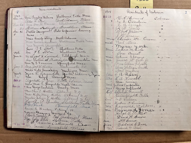 # 3639-1 & 2 ... Library ledgers from 1894 and 1900. These were for the old library, which was in librarian Katherine Cram's house (Joan McQuade 2024) . The ledgers record which books were borrowed and by whom.